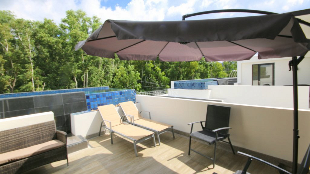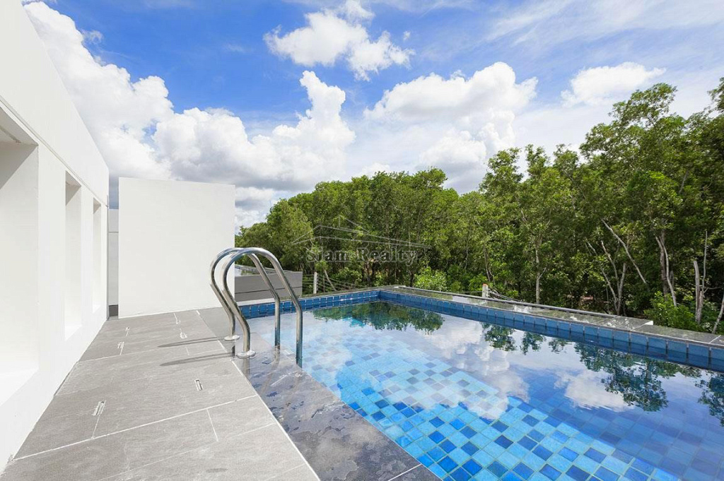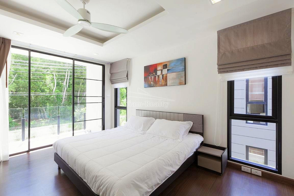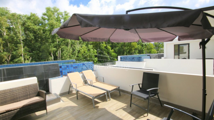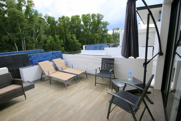 Вилла имеет три уровня, бассейн располагается на третьем уровне. На террассе гости виллы могут насладиться солнцем, воздухом и прекрасным видом на зеленые холмы Пхукета.. На вилле 5 спален и 5 ванных комнат. На первом этаже уютная гостиная с мягкой мебелью и телевизором, одна спальная, большая кухня и ванная. Кухня полностью оборудована новейшей современной техникой - холодильник, плита, духовка, стиральная машина, блендер, чайник, вся посуда, сковороды и кастрюли, есть утюг и гладильная доска. На втором этаже - три другие спальни с отдельными ванными комнатами. В главной спальне – двуспальная кровать, отдельная большая гардеробная, балкон и ванная. В других спальнях также кровати и встроенные плательные шкафы, каждая спальня с отдельной ванной комнатой. Кондиционеры во всех комнатах виллы. Крытая парковка, зеленая лужайка вокруг дома, зона отдыха со столом и стульями.